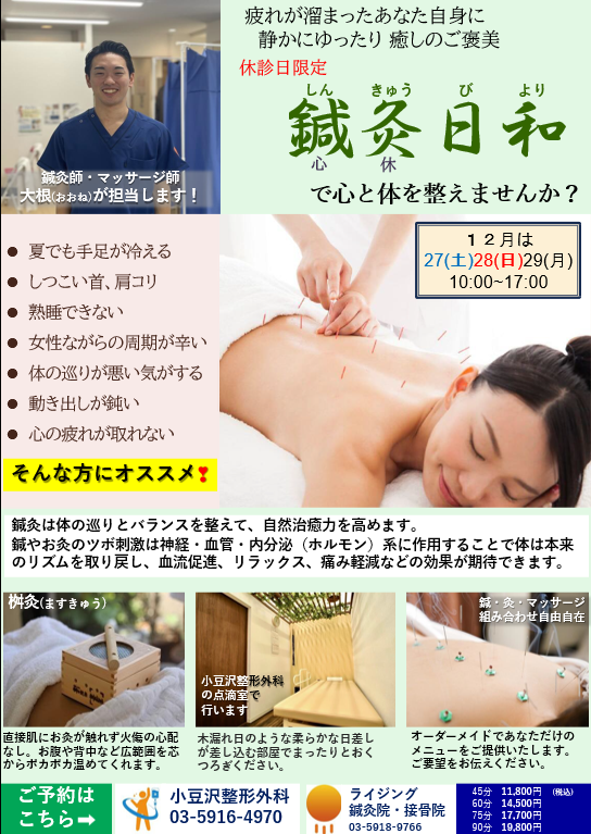 鍼灸日和は27.28.29となっていますが小豆沢整形外科もライジング鍼灸接骨院も営業は12/26(金)までです。お気を付けください。